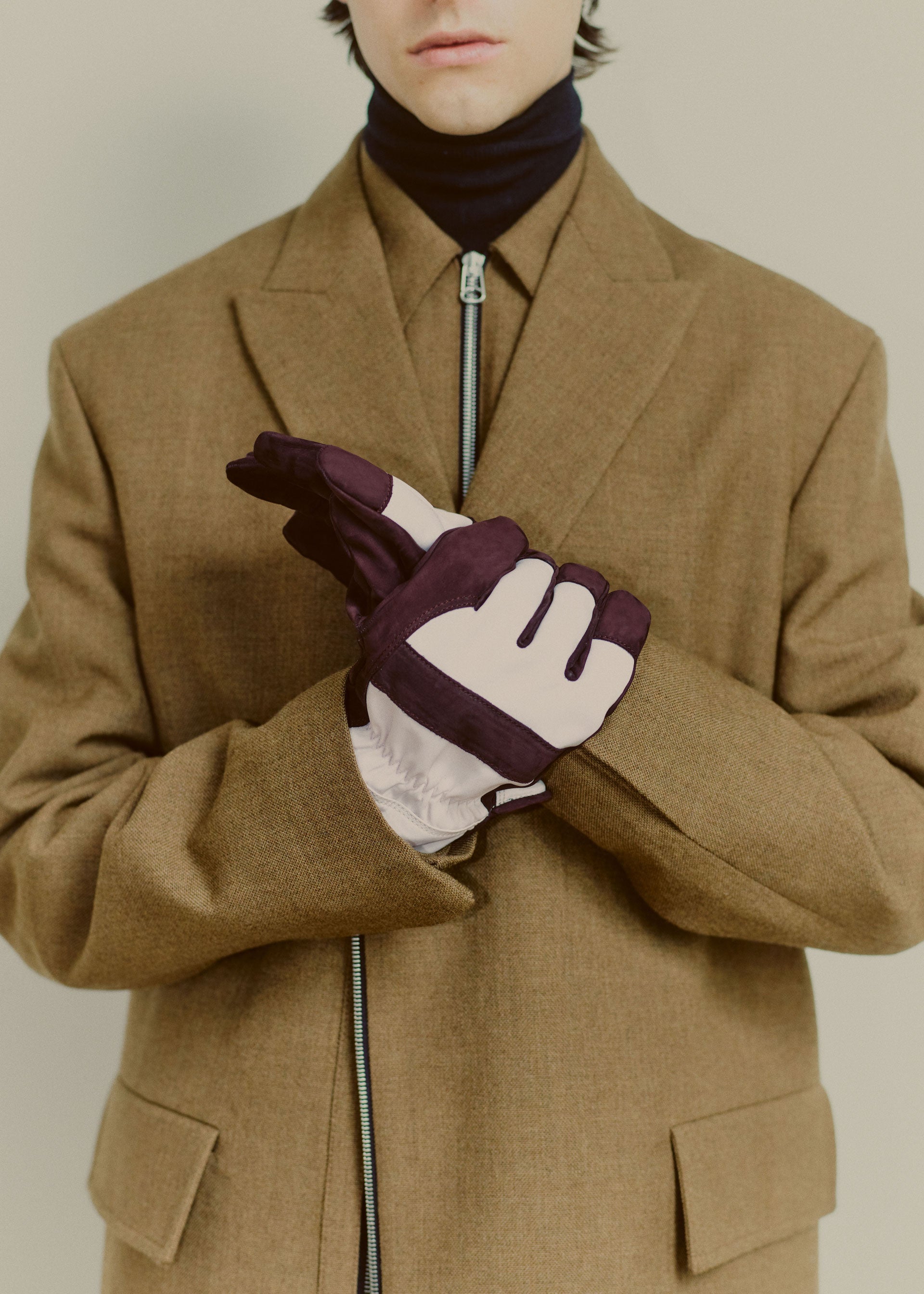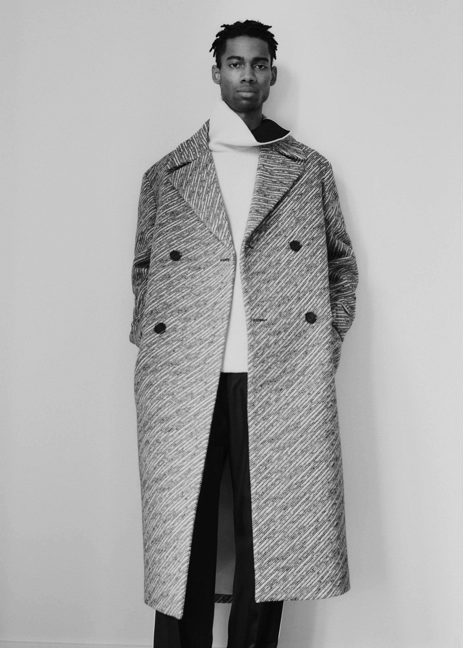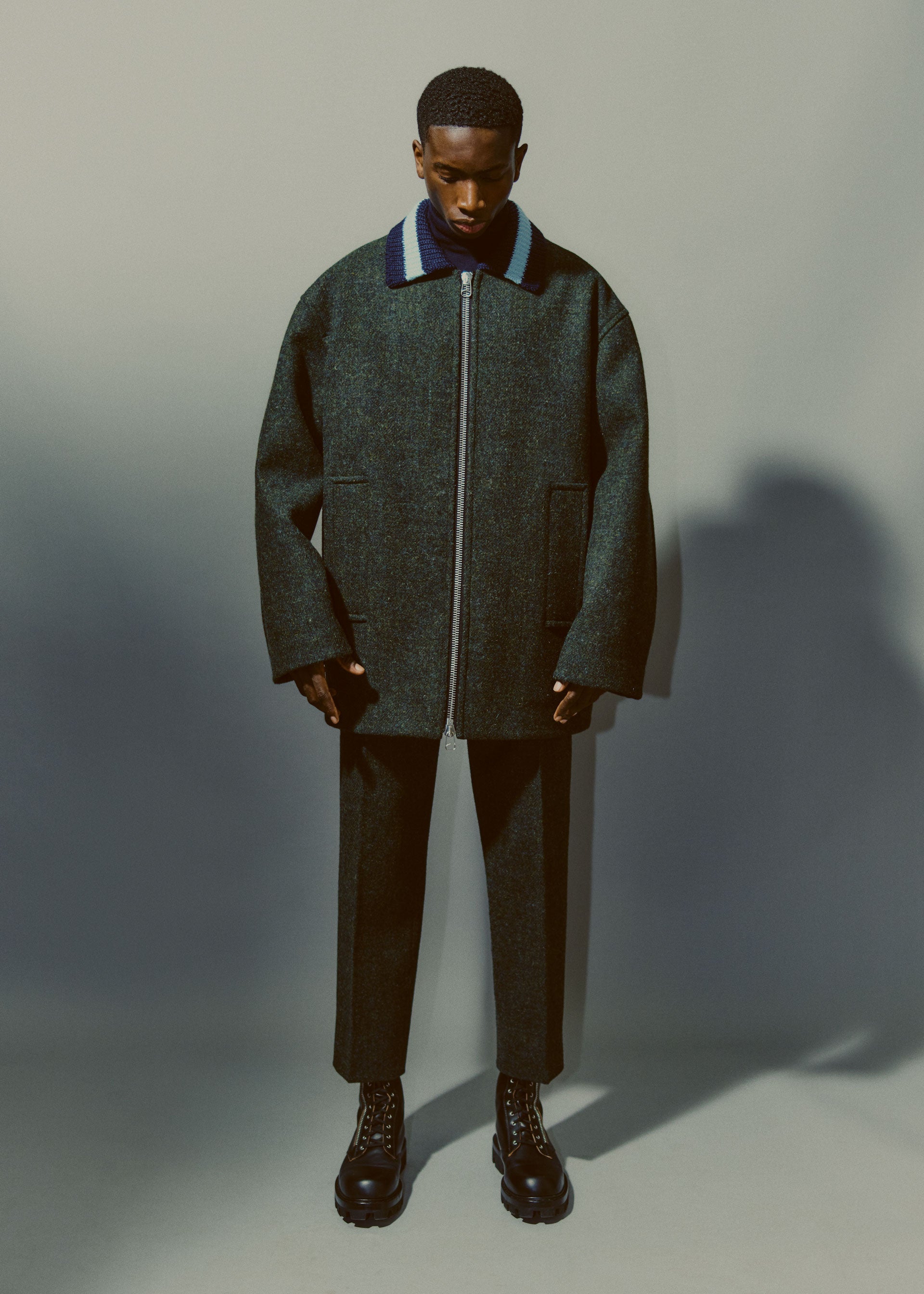However, beyond the simple opposition of materials, the study evolved into mixing ideas and feelings, a reflection of the place and time we find ourselves in now. Elevated materials utilized in more relaxed shapes, such as track suits and cozy inflated pieces, leather jackets and trousers with elastics and coulisse adjustments, roomy jacquard wool overshirts, and double-faced shetland and viscose/nylon flared collar knits. Garments that can both be worn during long stints at home, or in transit (when possible). The underlying feeling being one that reflects an attitude that even if we are required to remain in place, we still appreciate and desire well made, beautiful things.