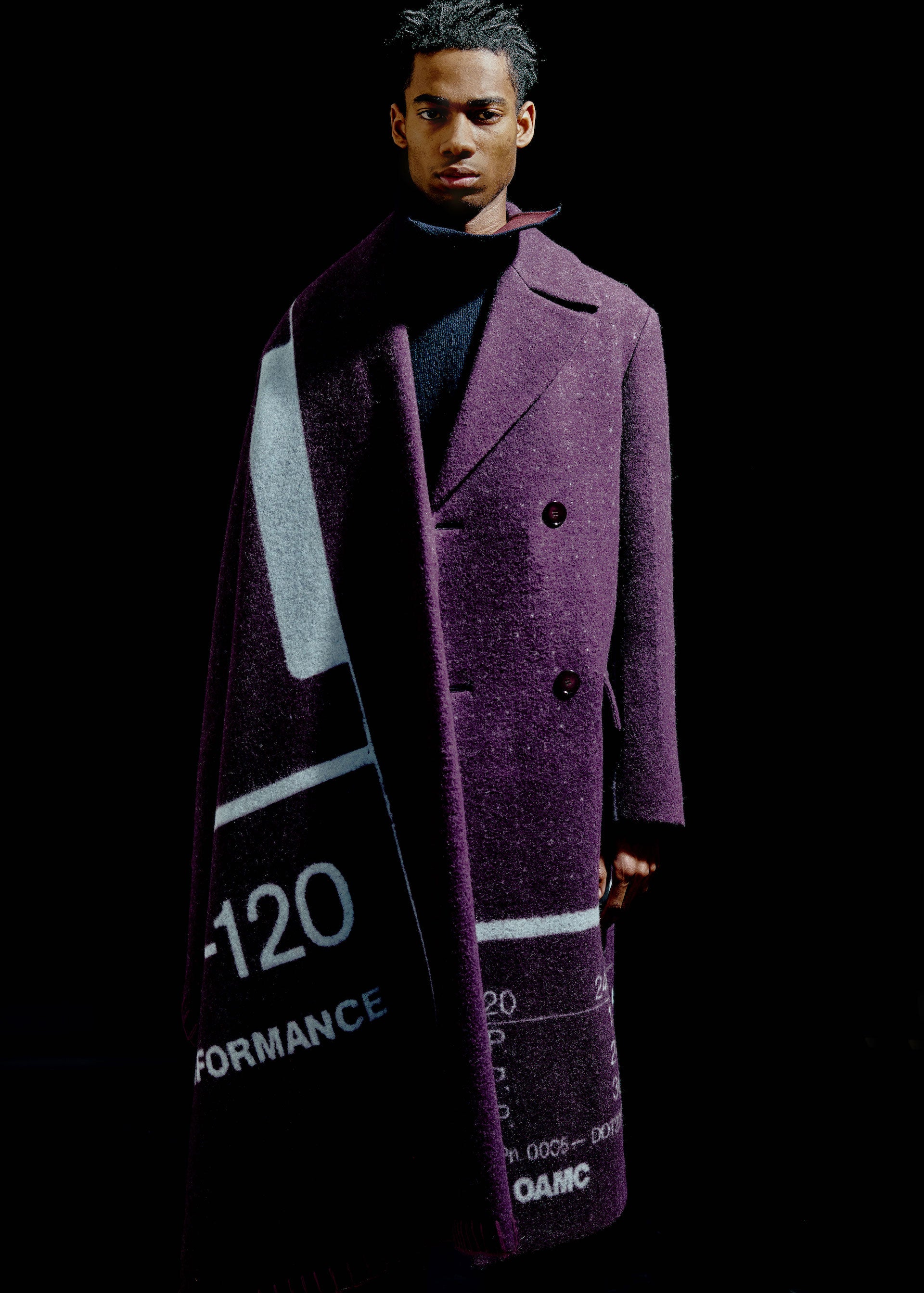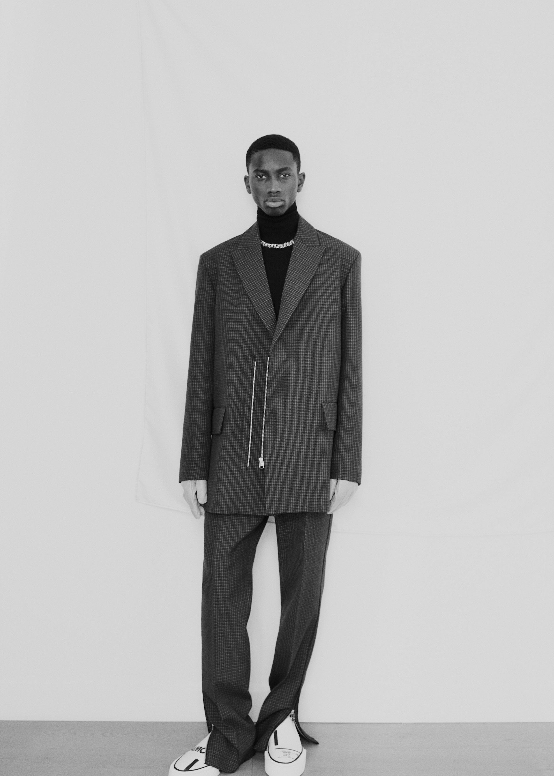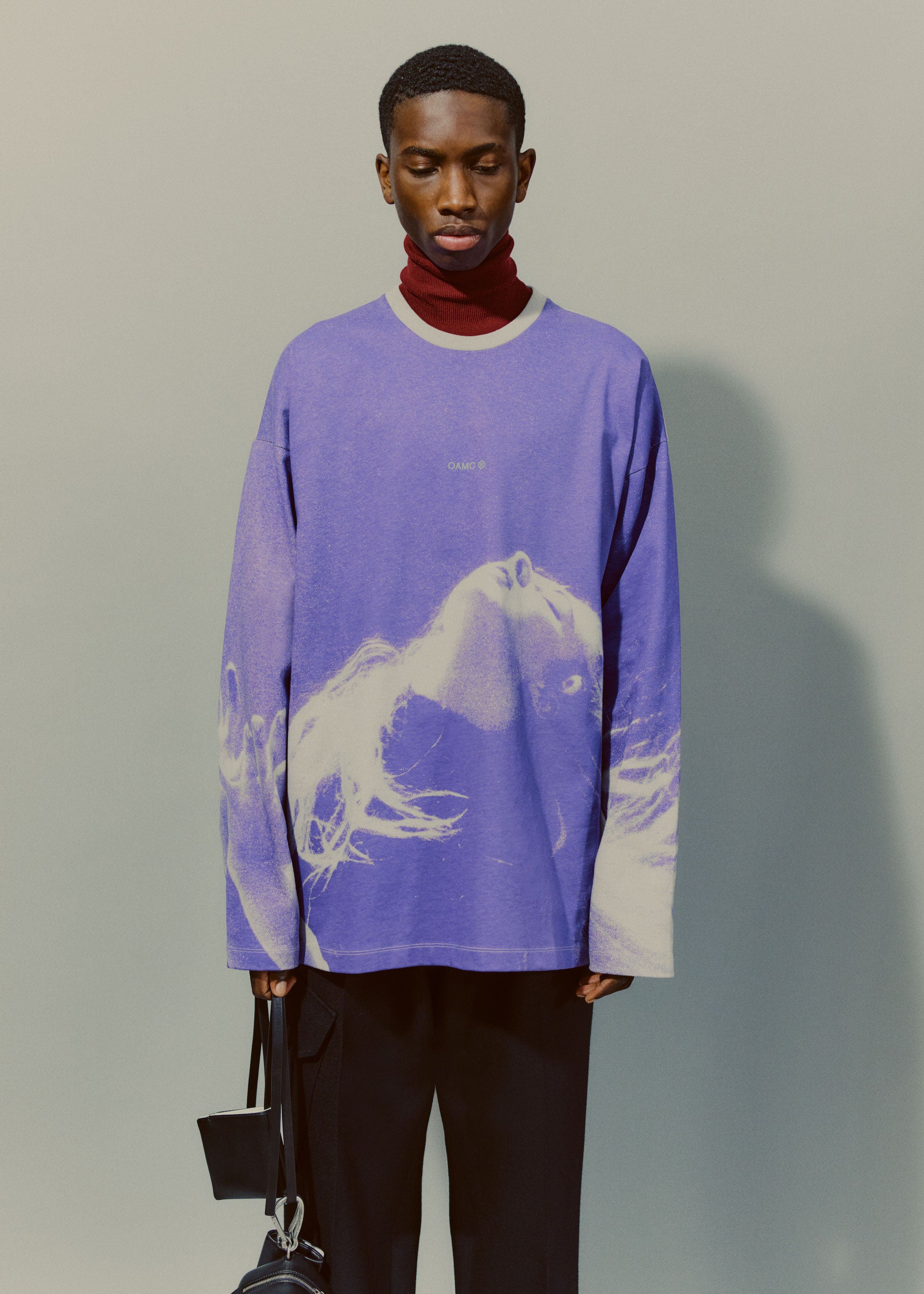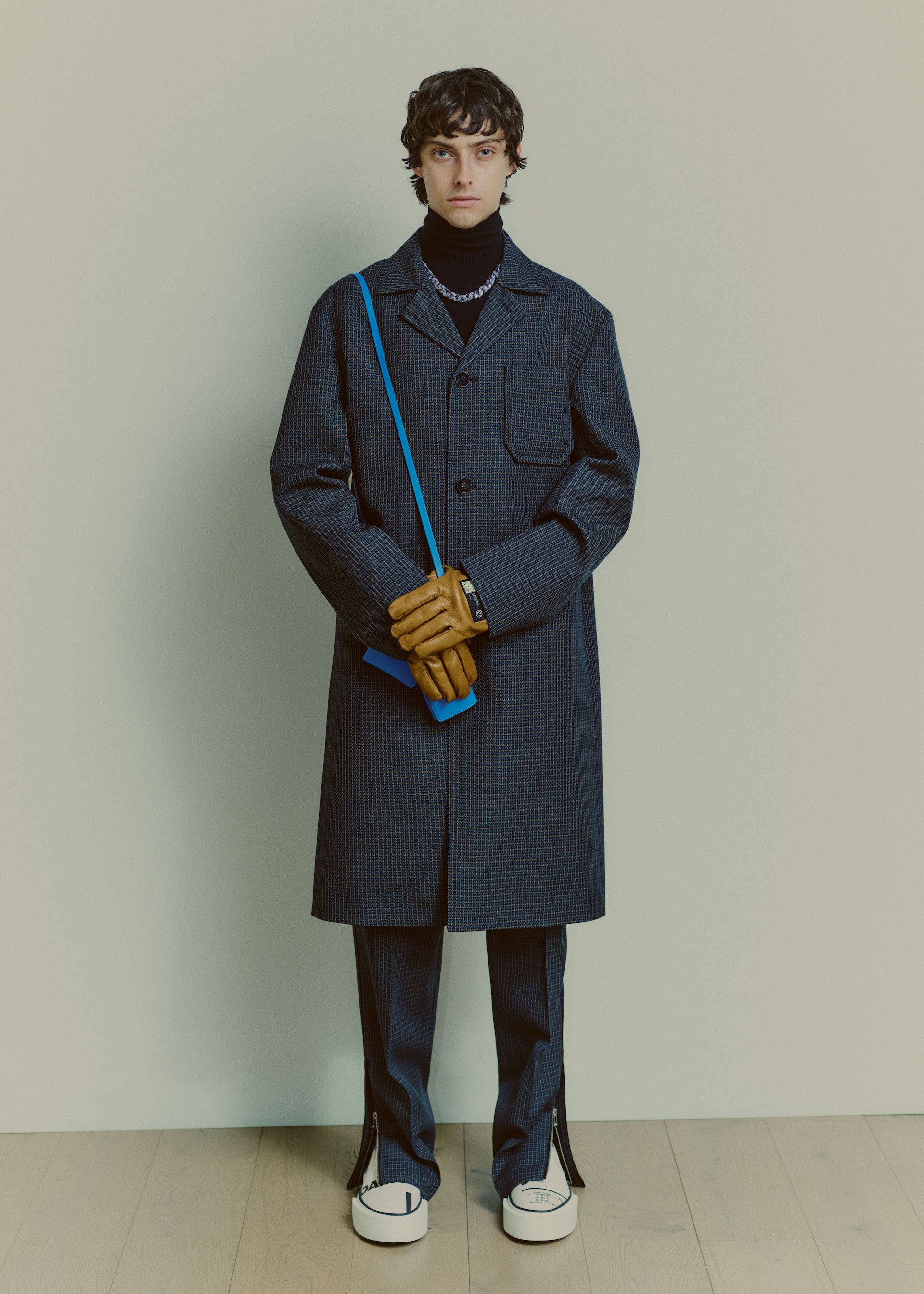 Accessories reflect both the collage approach as well as transparency. Gloves are mixed material and industrial, bags and cross-body small leather goods are supple and inflated, with hard metal detailing, and necklaces are strong link metal chains intricately woven with utility cords. Continuing the collaboration with adidas, OAMC has designed the Type O-9, featuring the bounce outsole and sculpted transparent TPU upper pieces that envelop the shoe, revealing the high-pile suede and leather panelling underneath. Utility boots are flooded in color, featuring custom tinted Vibram outsoles.