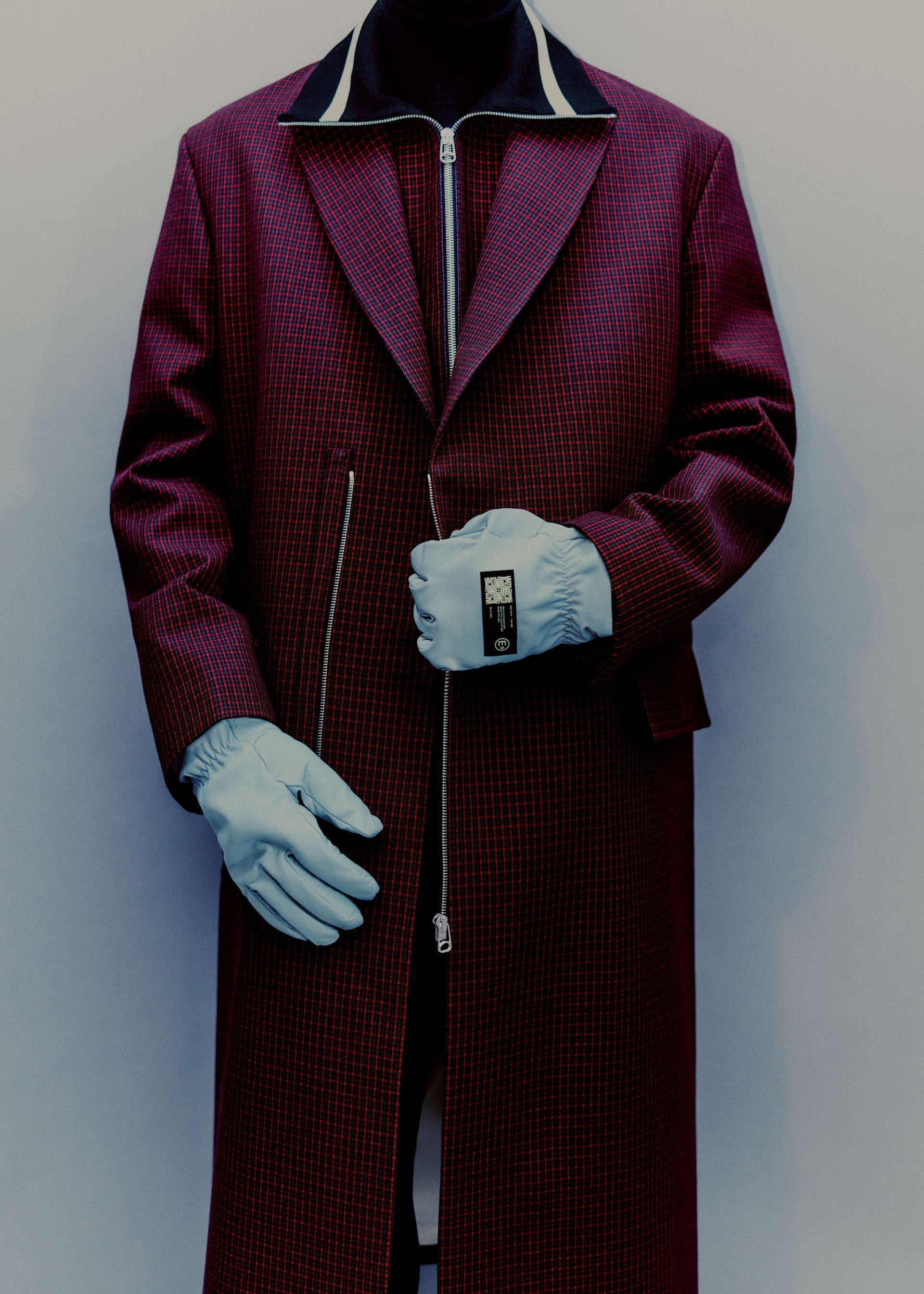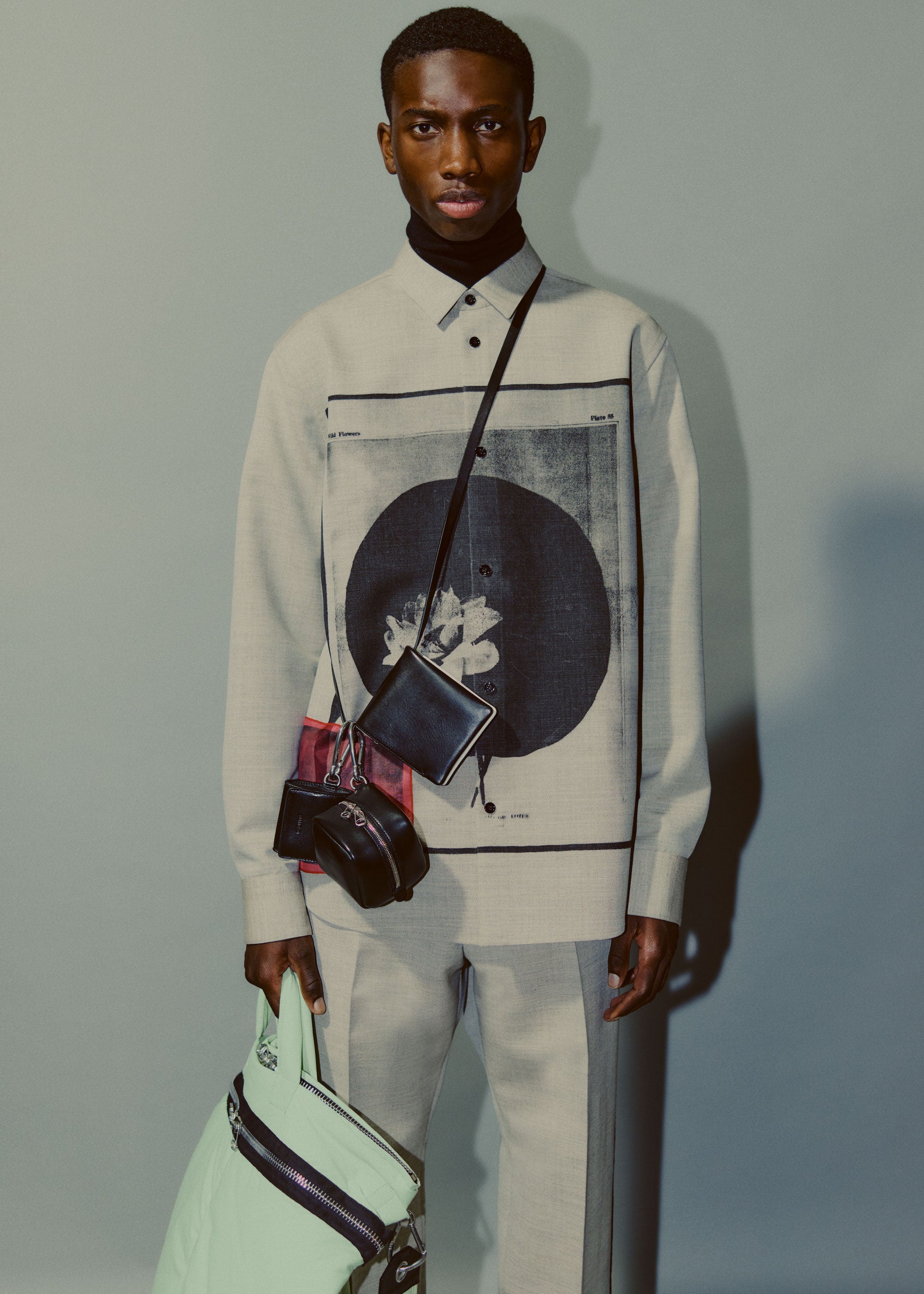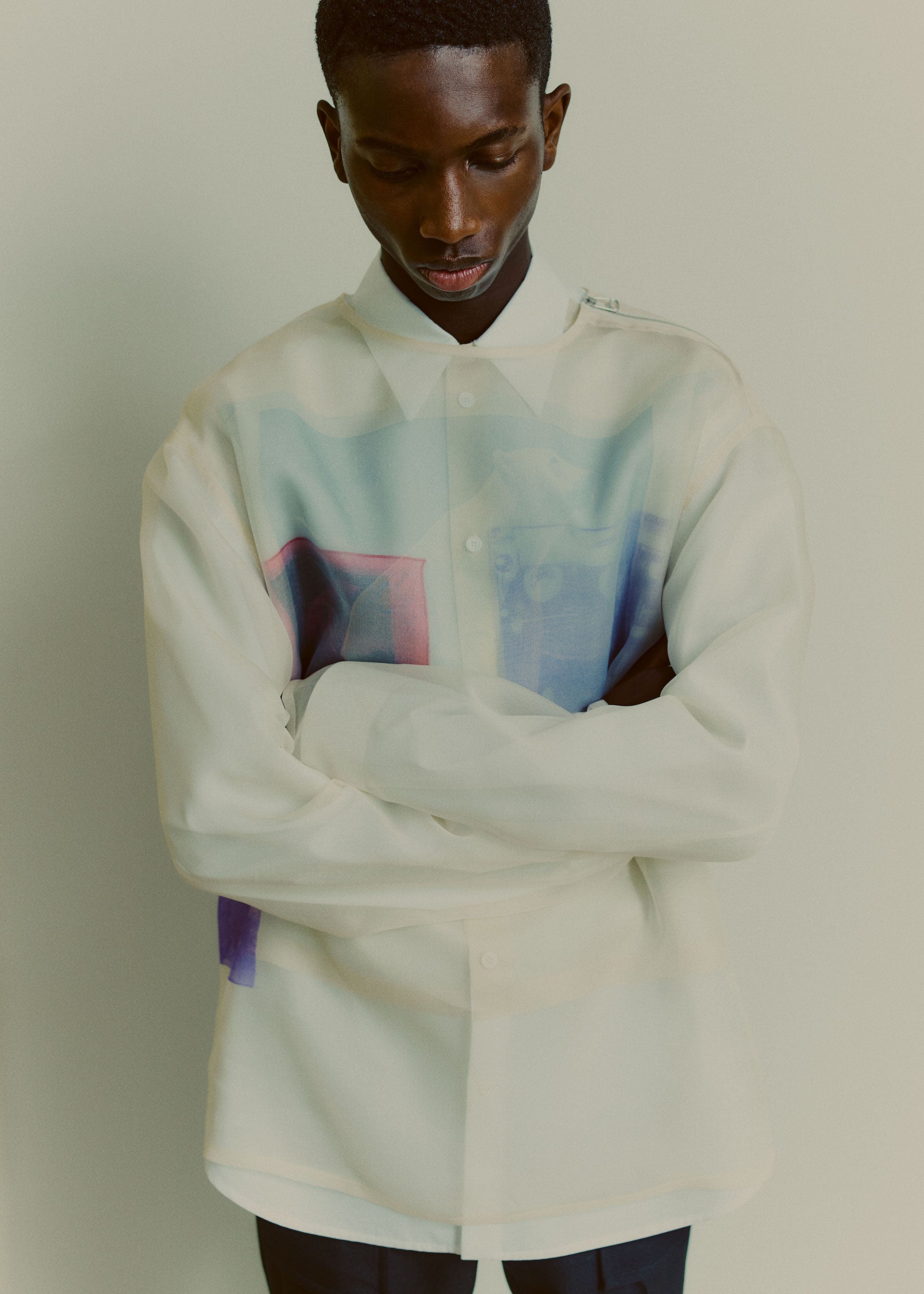 Collages and assemblages. In Rauschenberg’s vocabulary, ‘combines’. The idea of mixing materials, which Rauschenberg gained through his experience in his first year at the legendary black mountain college, under the guidance of Josef Albers. This idea is often at the root of design: finding the correct balance and vibration between two different materials, colors, or techniques, and was the initial starting point for the Fall/Winter 2021 collection. Mixed materials take the form of organza panels applied to sharp Japanese wool or cotton poplin overshirts, chunky knit collars attached to wool coats, and heavy metal hardware cutting through tailoring, shirting, footwear, and accessories.