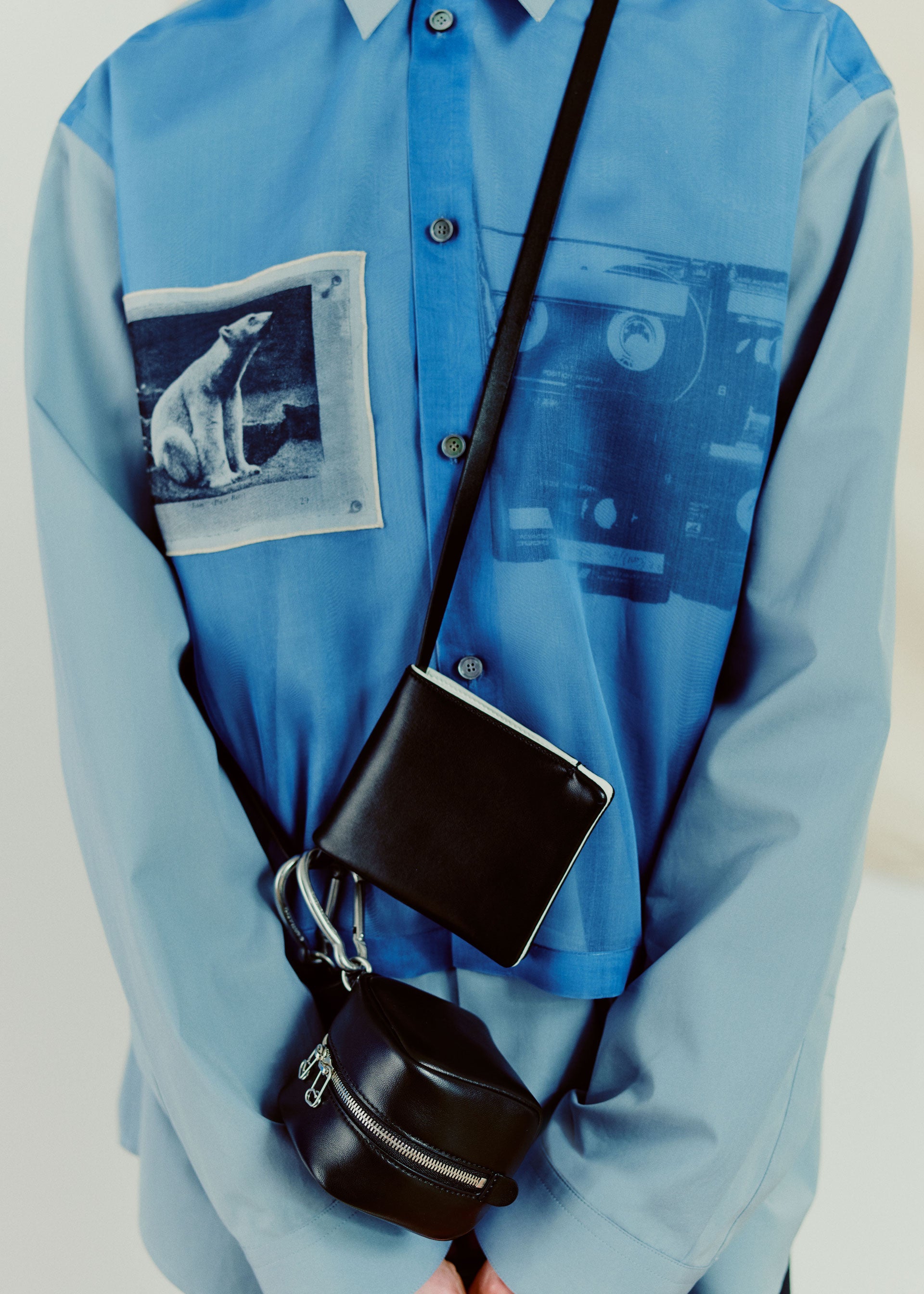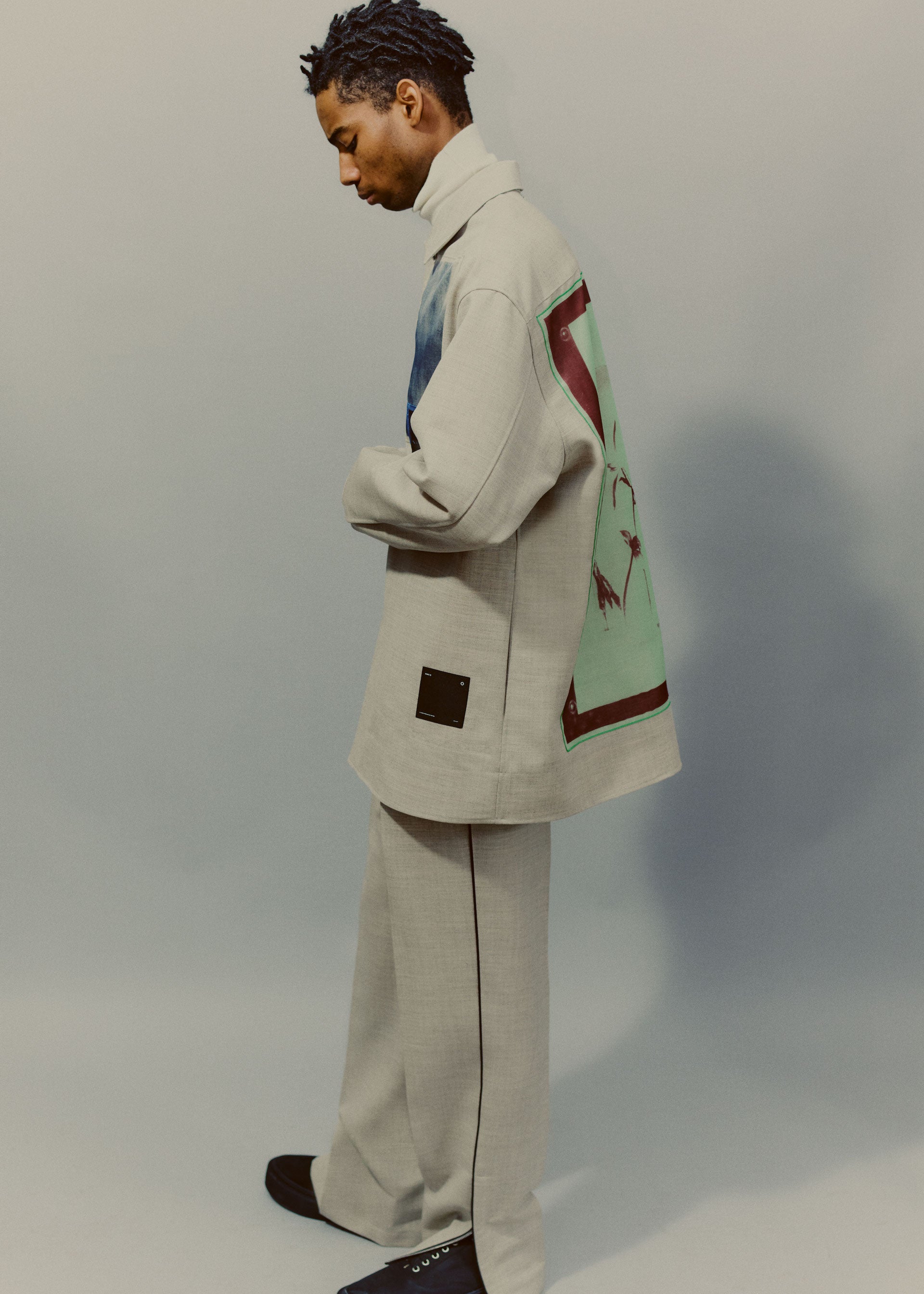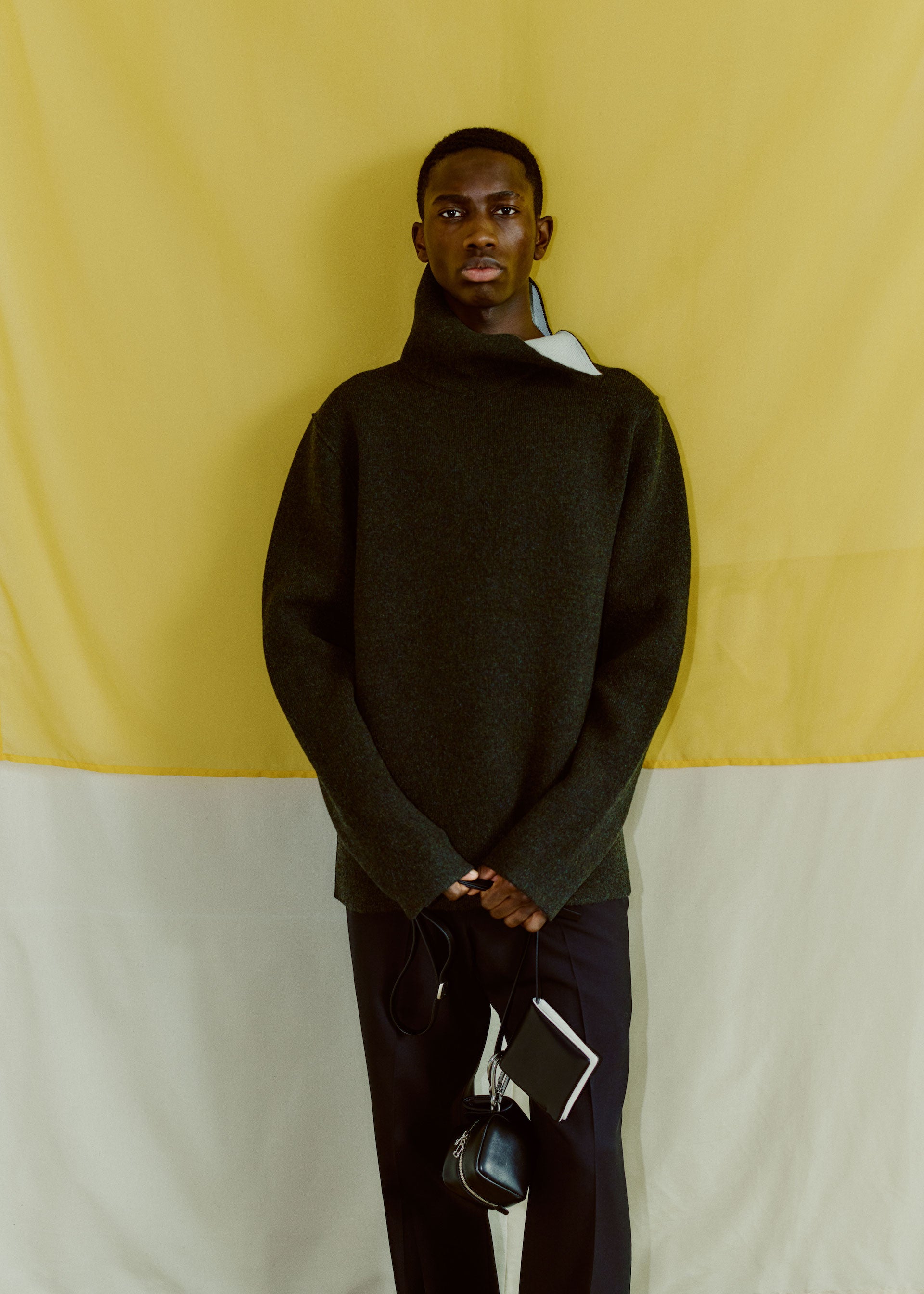 Collages and assemblages. In Rauschenberg’s vocabulary, ‘combines’. The idea of mixing materials, which Rauschenberg gained through his experience in his first year at the legendary black mountain college, under the guidance of Josef Albers. This idea is often at the root of design: finding the correct balance and vibration between two different materials, colors, or techniques, and was the initial starting point for the Fall/Winter 2021 collection. Mixed materials take the form of organza panels applied to sharp Japanese wool or cotton poplin overshirts, chunky knit collars attached to wool coats, and heavy metal hardware cutting through tailoring, shirting, footwear, and accessories.
