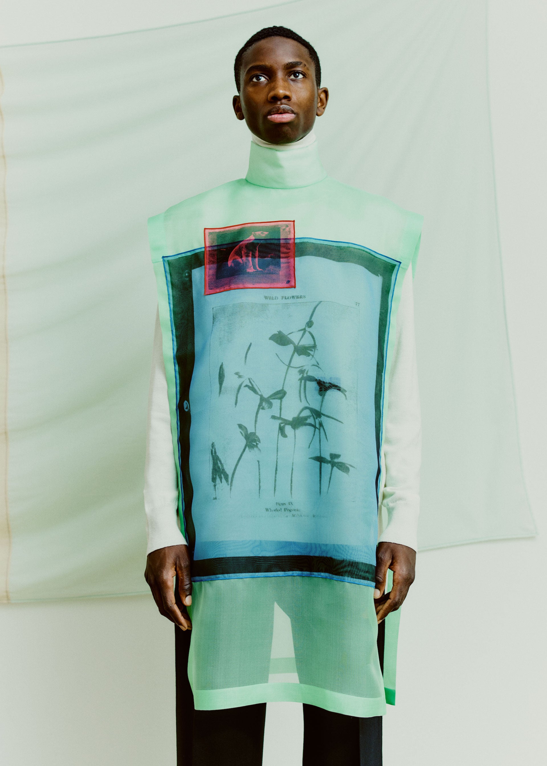 The palette reflects both a sophistication as well as a utilitarian vibrance. Melange Harris Tweed wools in warm brown and petrol are mixed with bright yellow, fuchsia, mint green, and pale blue. Black and white jacquard heavy diagonal wool coating is contrast by deep green, navy, and misty grey. Slick black leather is met by bright blue and ceramic white. Organza in bright green, yellow, blue, and red as well as natural white provides the bases for exquisite cyanotype-derived print motifs in black, purple, and aqua.